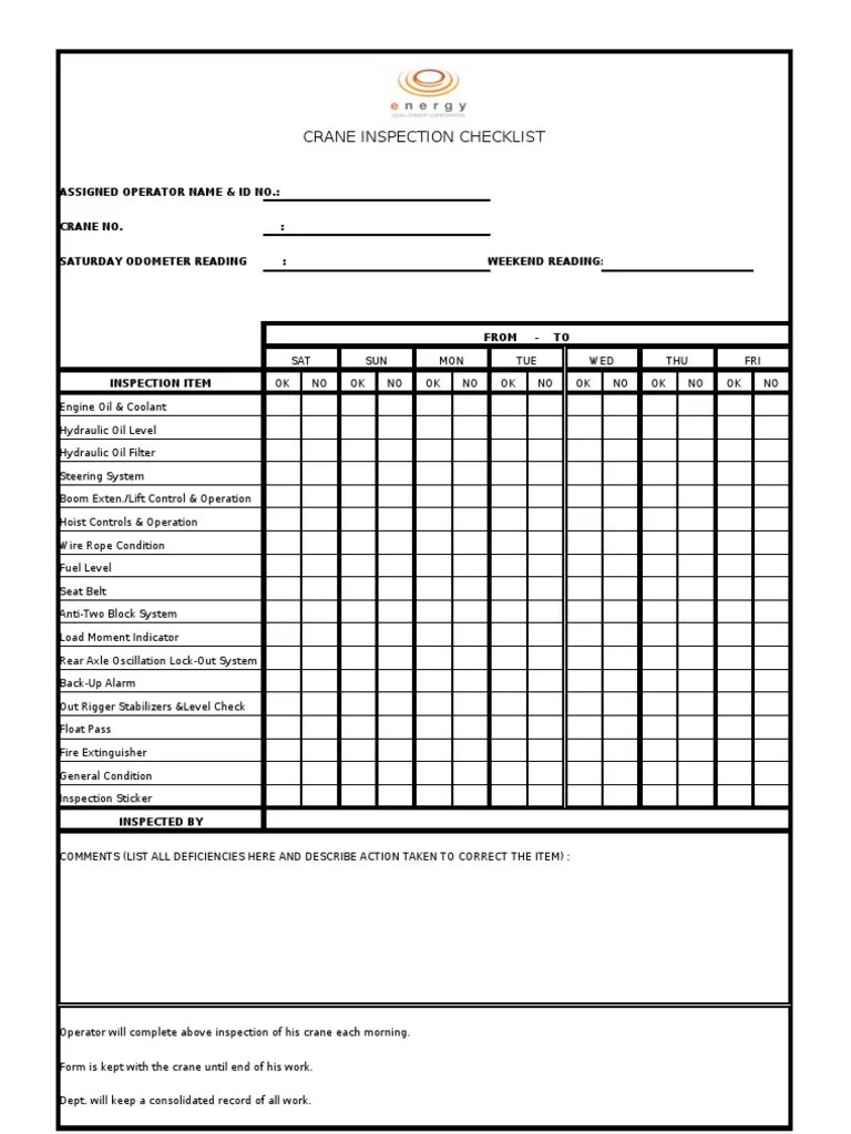 Printable Crane Inspection Checklist - 2 check that warning labels are. Web 1 ensure load rating is marked on each side of the crane or hoist and legible from the floor. Web the person you select to perform the inspection must look at and test all critical crane components, including.
