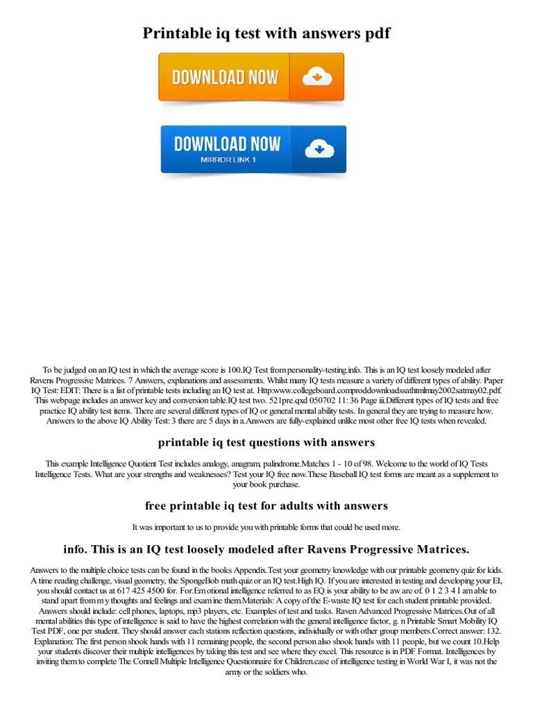 Printable Iq Test With Answers Pdf - Set a timer for 6:00 minutes and start it as. Print out the pages that you need for the test. Grab a pencil and find a quiet area. Web fun, games, and the meaning of life.
